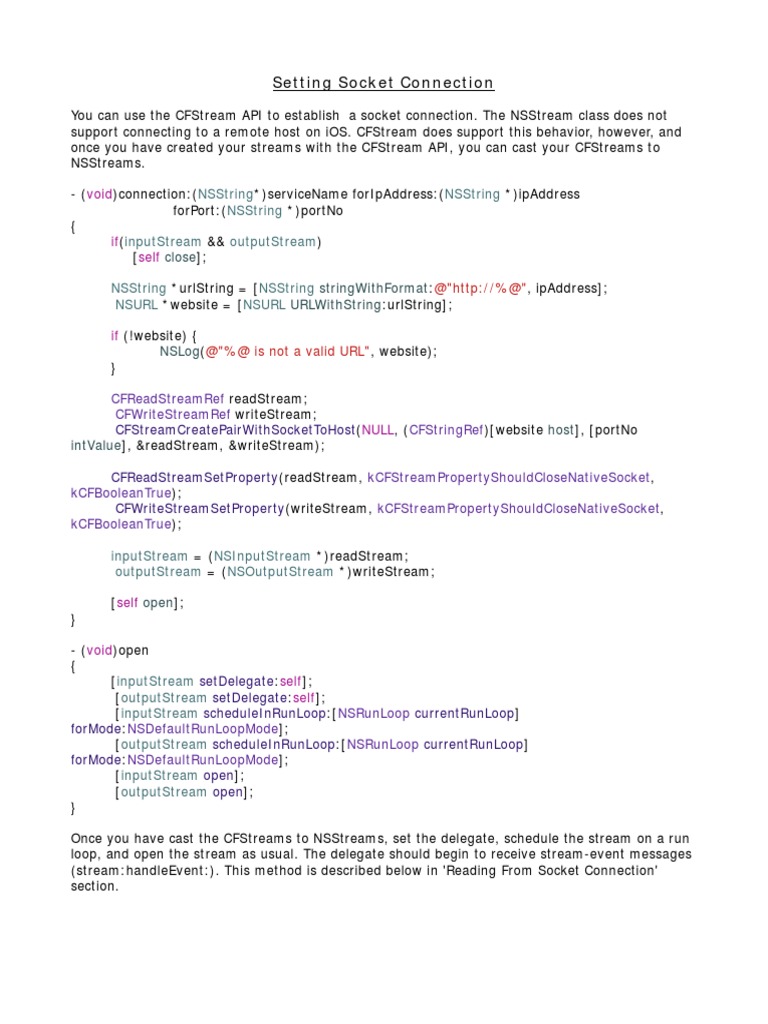 (stream:handleEvent:). This method is described below in 'Reading From Socket Connection'