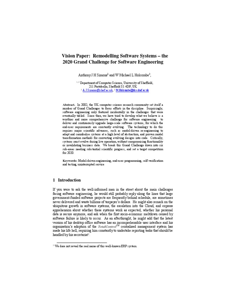 The 2010 call for new Grand Challenges attracted a software engineering-related