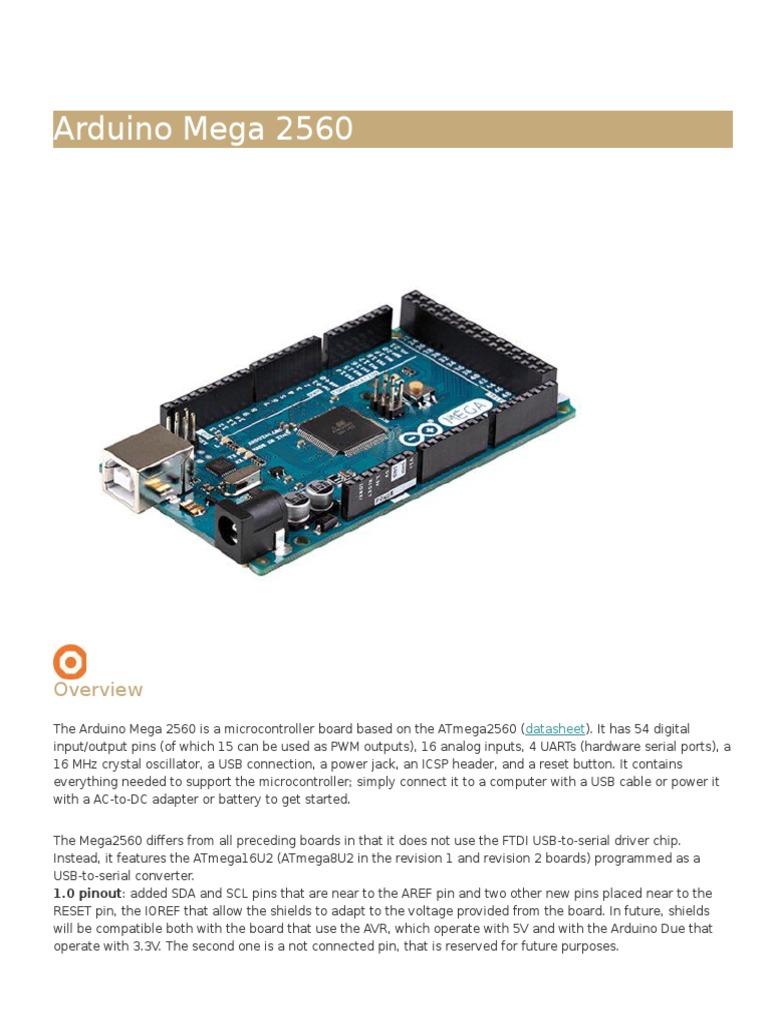 The Arduino Mega 2560 is a microcontroller board based on the ATmega2560 (datasheet). It has 54 digital