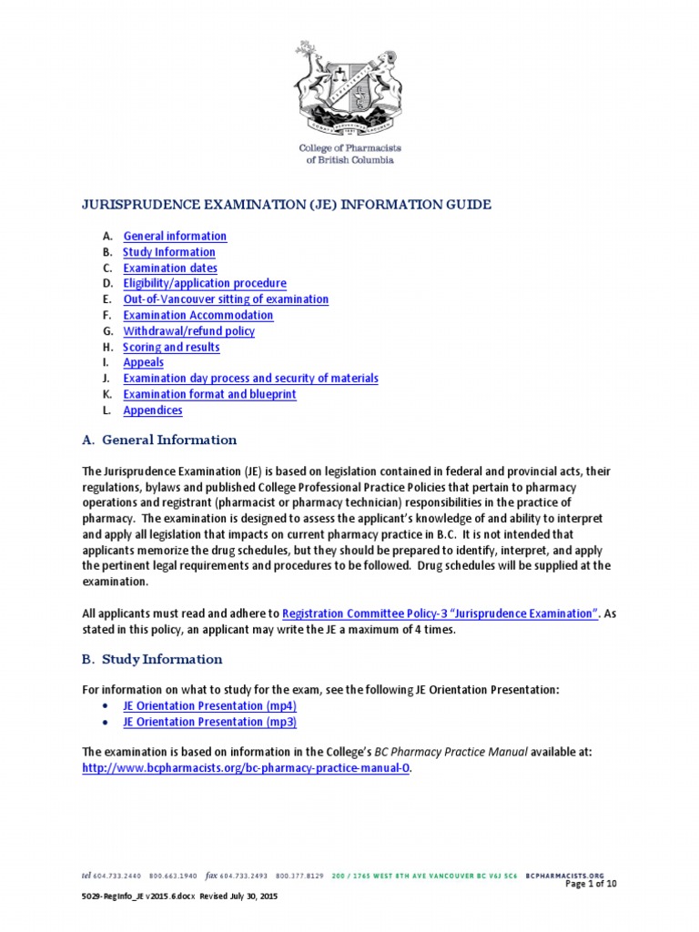 The Jurisprudence Examination (JE) is based on legislation contained in federal and provincial acts, their