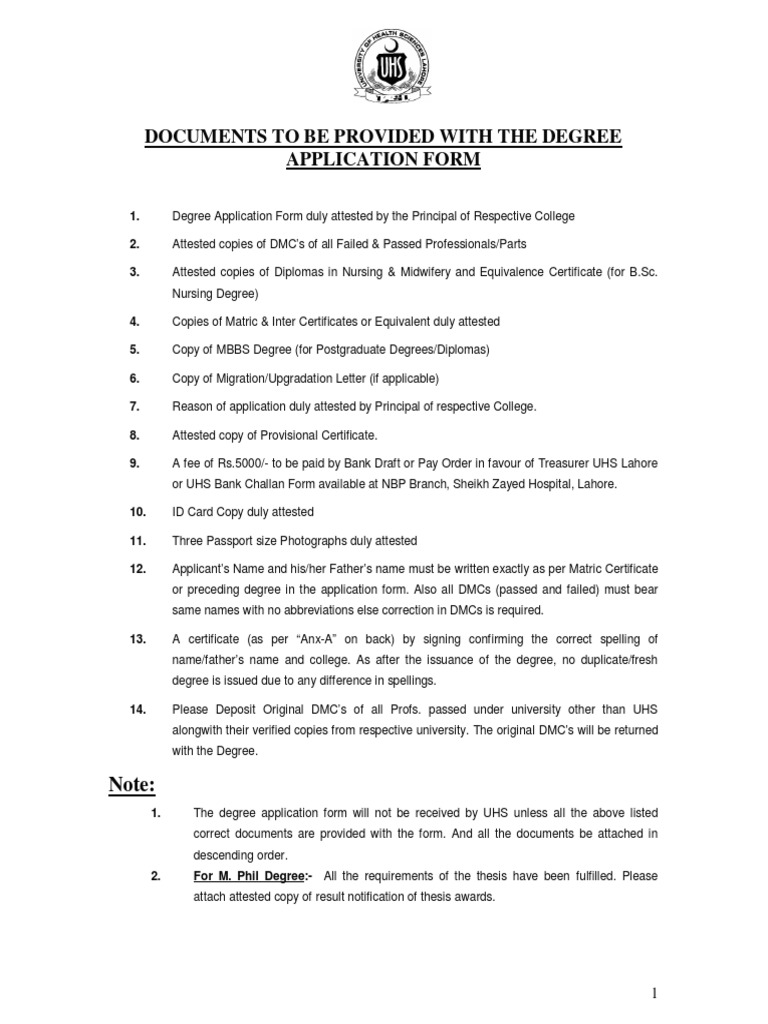 (To be handed over to UHS Degree Cell alongwith the Degree Application Form)