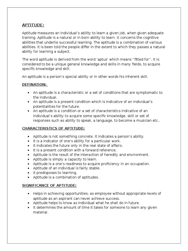 training. Aptitude is a natural or in born ability to learn. It concerns the cognitive