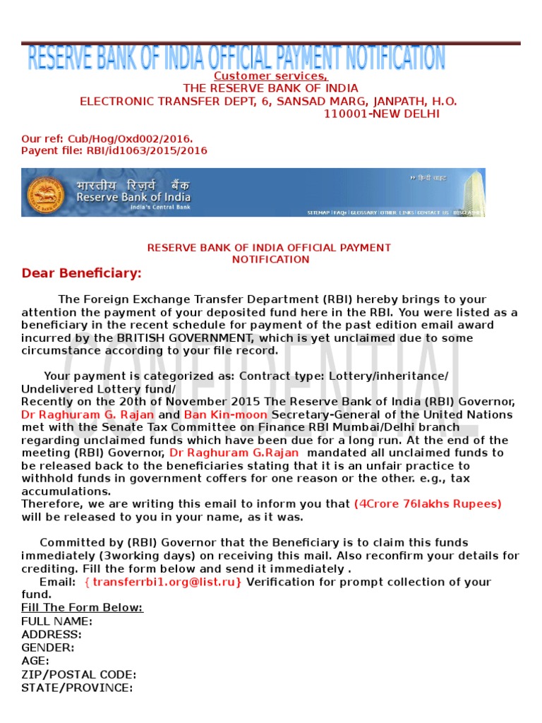 attention the payment of your deposited fund here in the RBI. You were listed as a