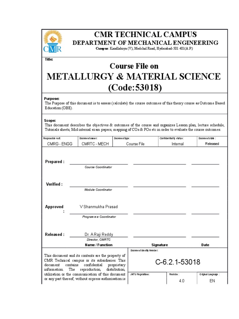 This document describes the objectives & outcomes of the course and organizes Lesson plan, lecture schedule,