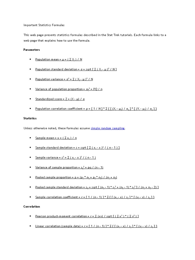 This web page presents statistics formulas described in the Stat Trek tutorials. Each formula links to a