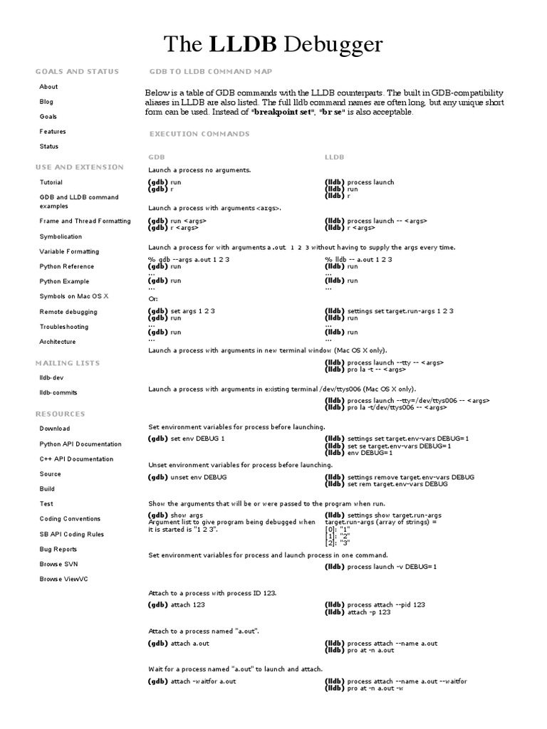 Below is a table of GDB commands with the LLDB counterparts. The built in GDB-compatibility