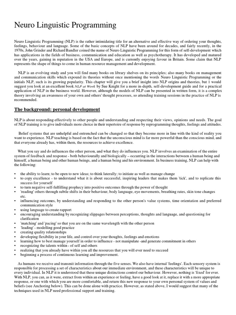and feeling. Among other things, NLP requires the ability to get in touch with the senses and to be able to 'read' thought processes