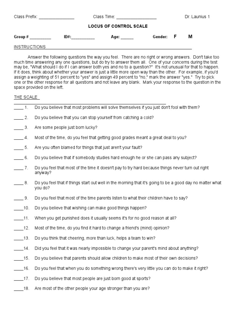 score on the Locus of Control Scale. Record your score at the top of the scale.
