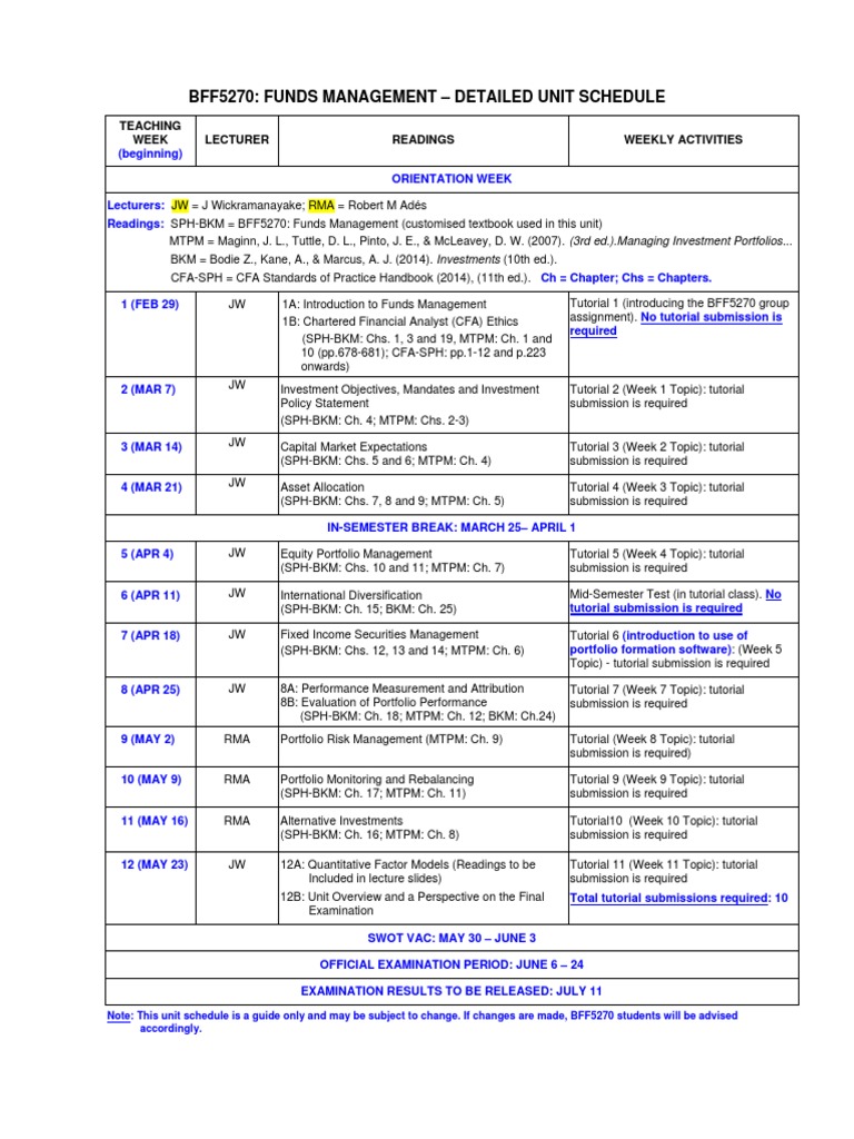 Note: This unit schedule is a guide only and may be subject to change. If changes are made, BFF5270 students will be advised