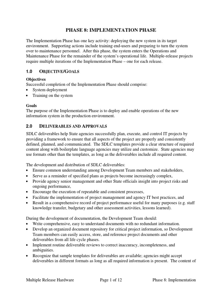 The purpose of the Implementation Phase is to deploy and enable operations of the new