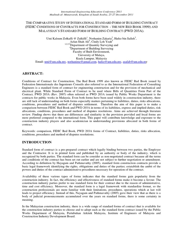 Keywords: comparison, FIDIC Red Book, PWD 203A forms of Contract, liabilities, duties, risks allocation,