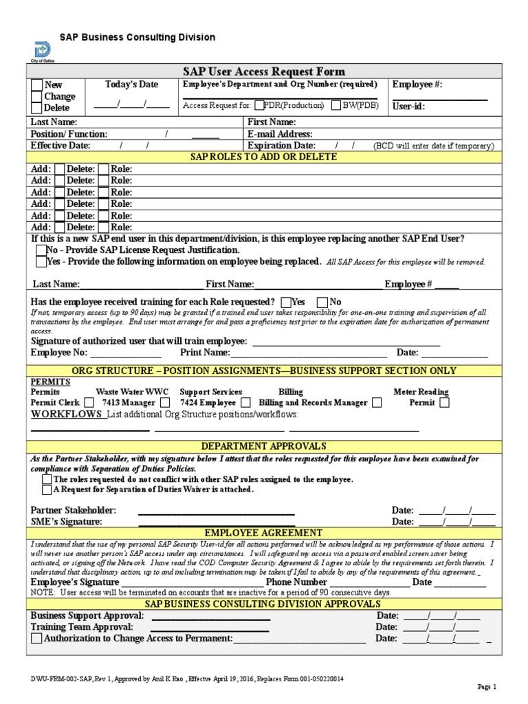 DWU-FRM-002-SAP, Rev 1, Approved by Anil K Rao , Effectve April 19, 2016, Replaces Form 001-050220014