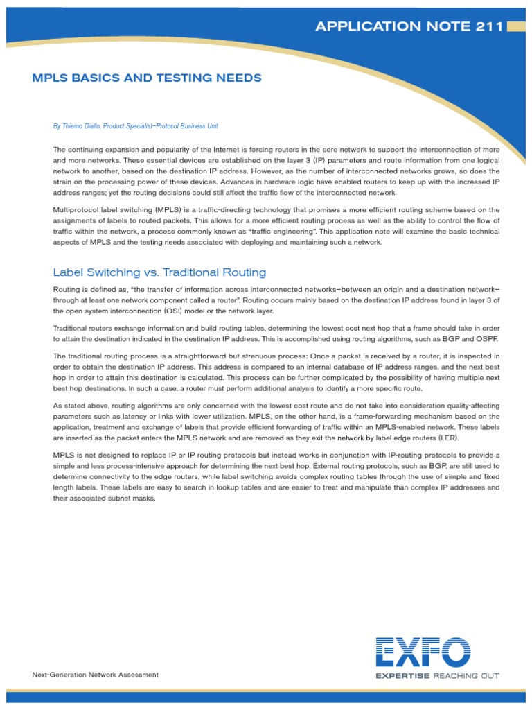 levels. EXFO offers compact, portable, comprehensive MPLS test solutions to efficiently qualify Ethernet services from end-to-end, validating
