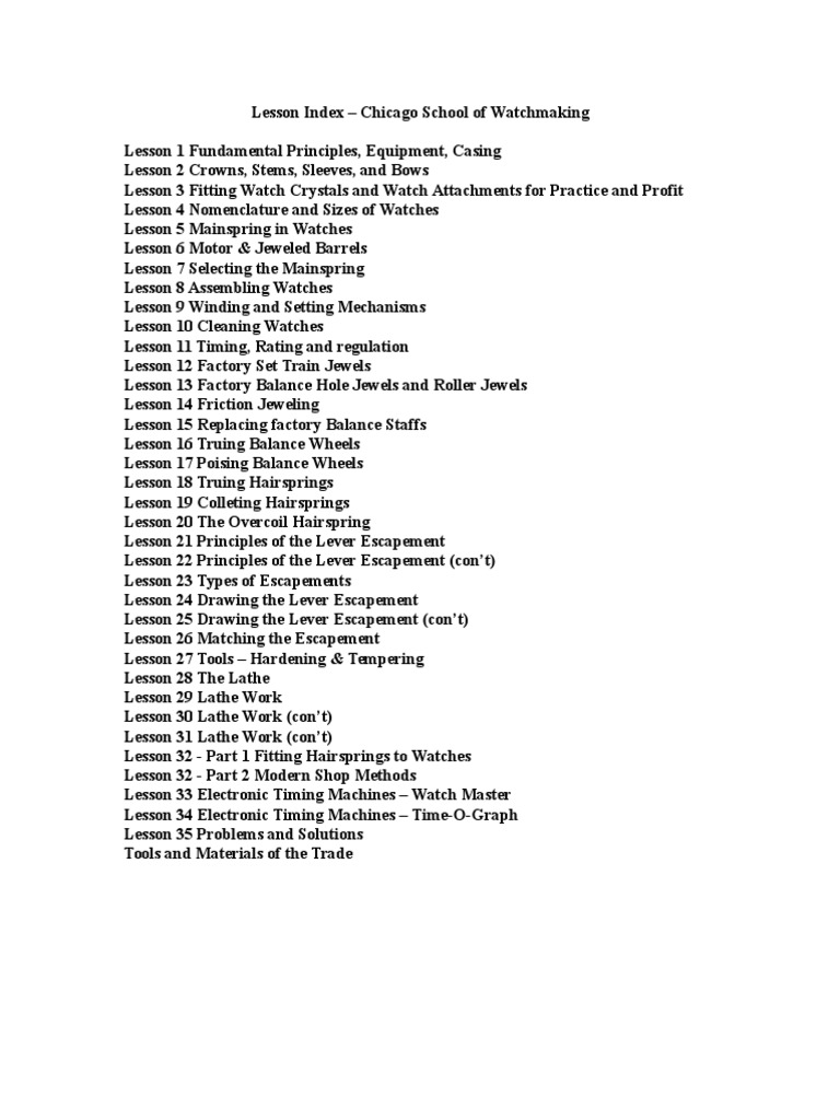 Lesson Index Chicago School of Watchmaking
