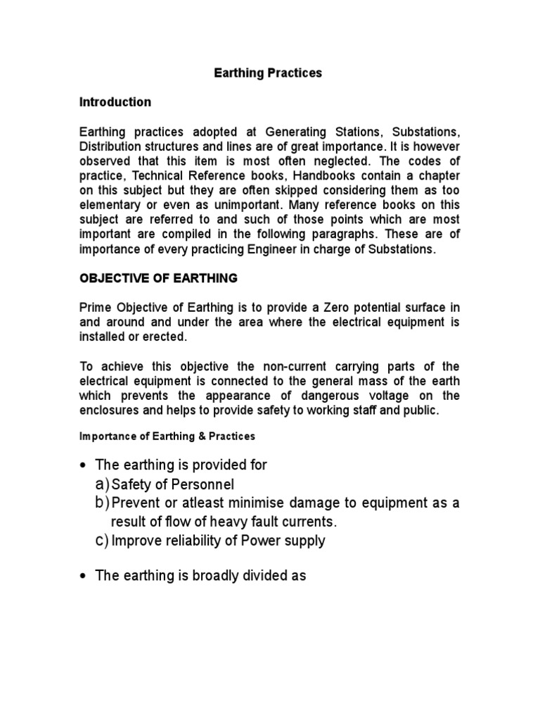 Prime Objective of Earthing is to provide a Zero potential surface in