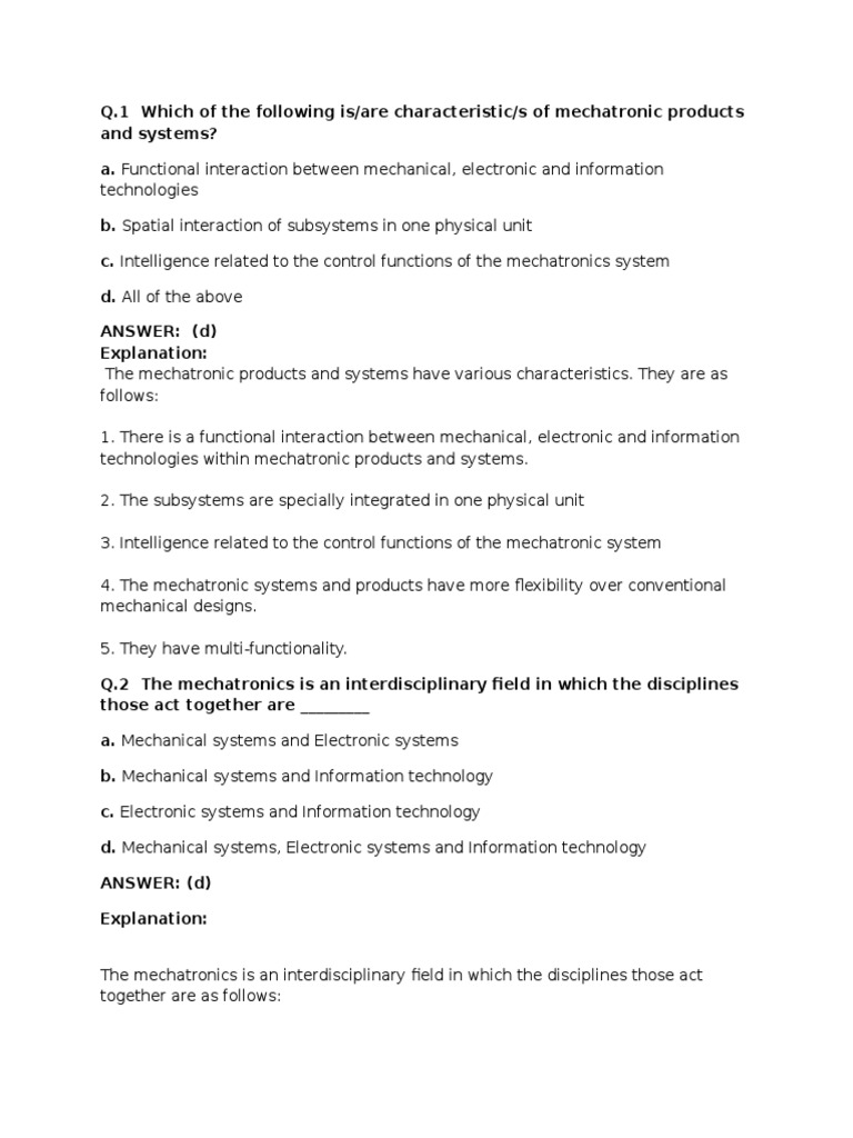 Q.2 The mechatronics is an interdisciplinary field in which the disciplines