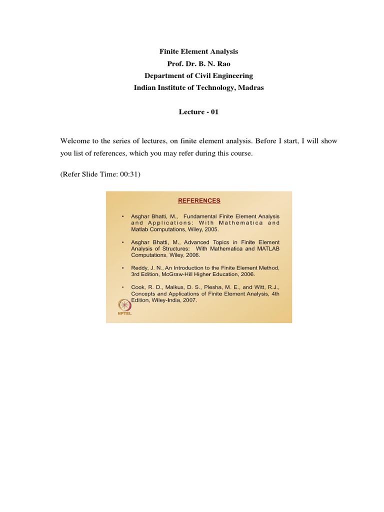 Welcome to the series of lectures, on finite element analysis. Before I start, I will show