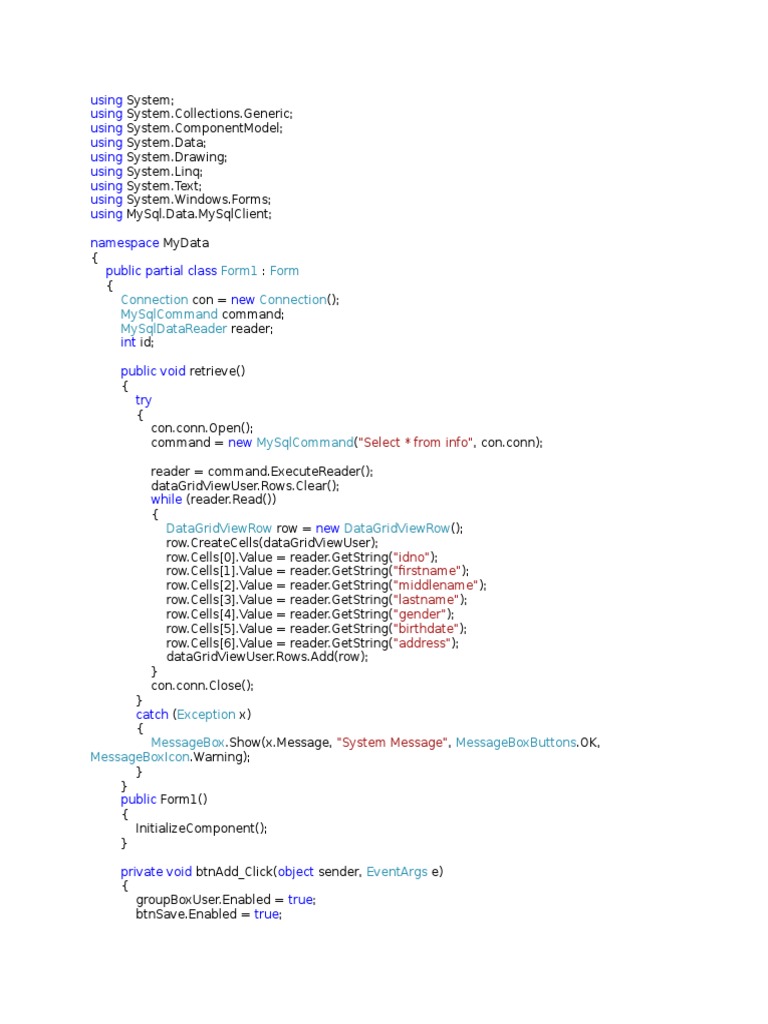 txtlname.Text.Trim() + "', gender = '" + cbogender.Text.Trim() + "', birthdate = '" +