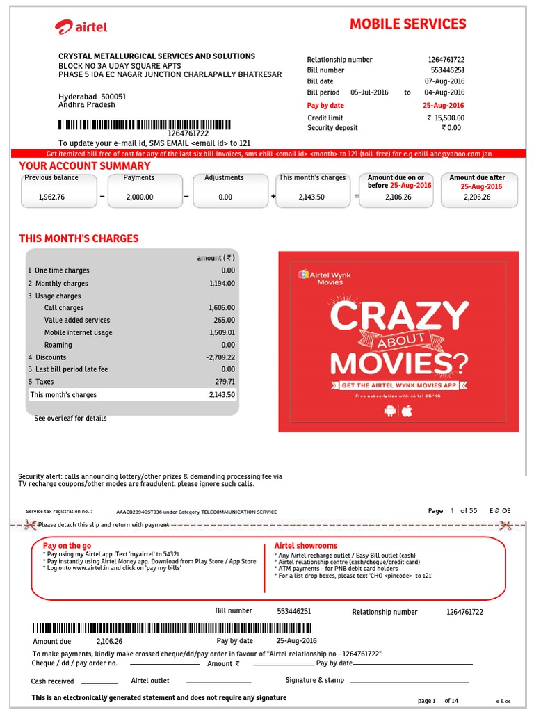 To make payments, kindly make crossed cheque/dd/pay order in favour of "Airtel relationship no - 1264761722"