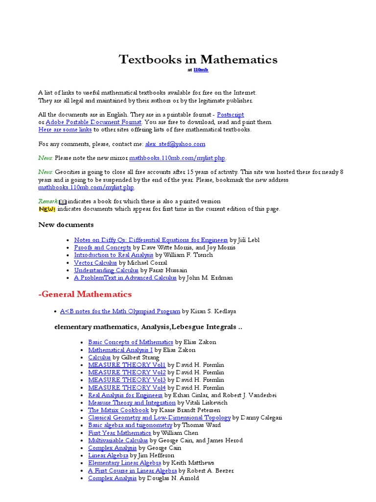 A list of links to useful mathematical textbooks available for free on the Internet.