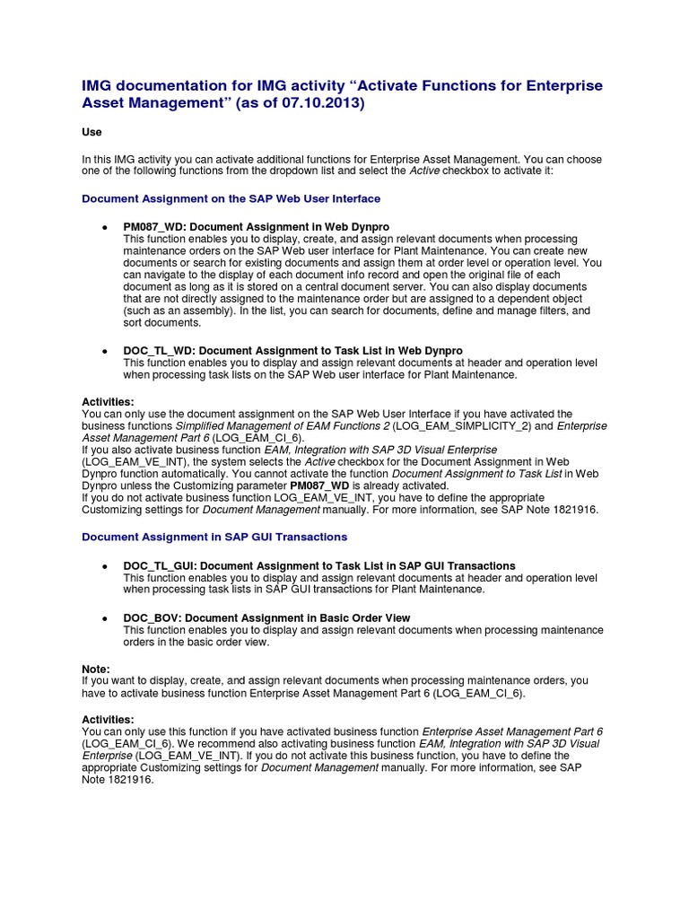 In this IMG activity you can activate additional functions for Enterprise Asset Management. You can choose