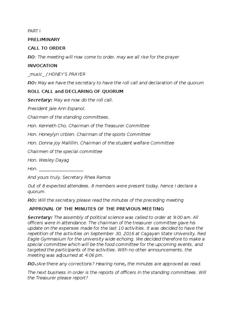 Secretary: The assembly of political science was called to order at 9:00 am. All