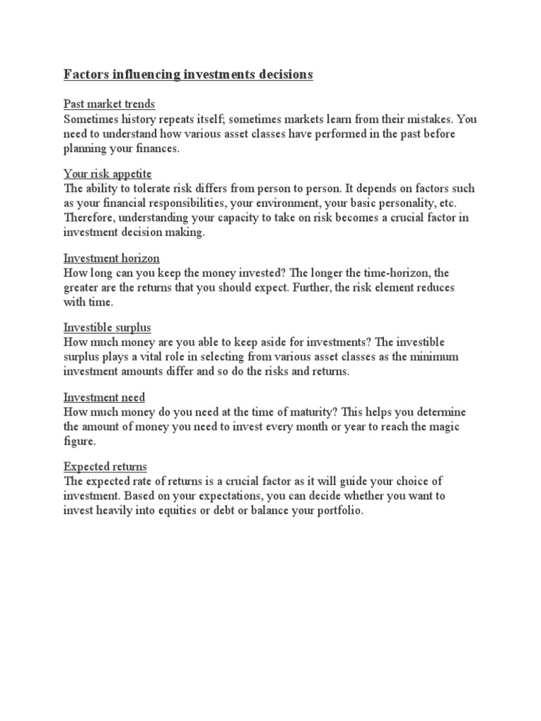 The expected rate of returns is a crucial factor as it will guide your choice of