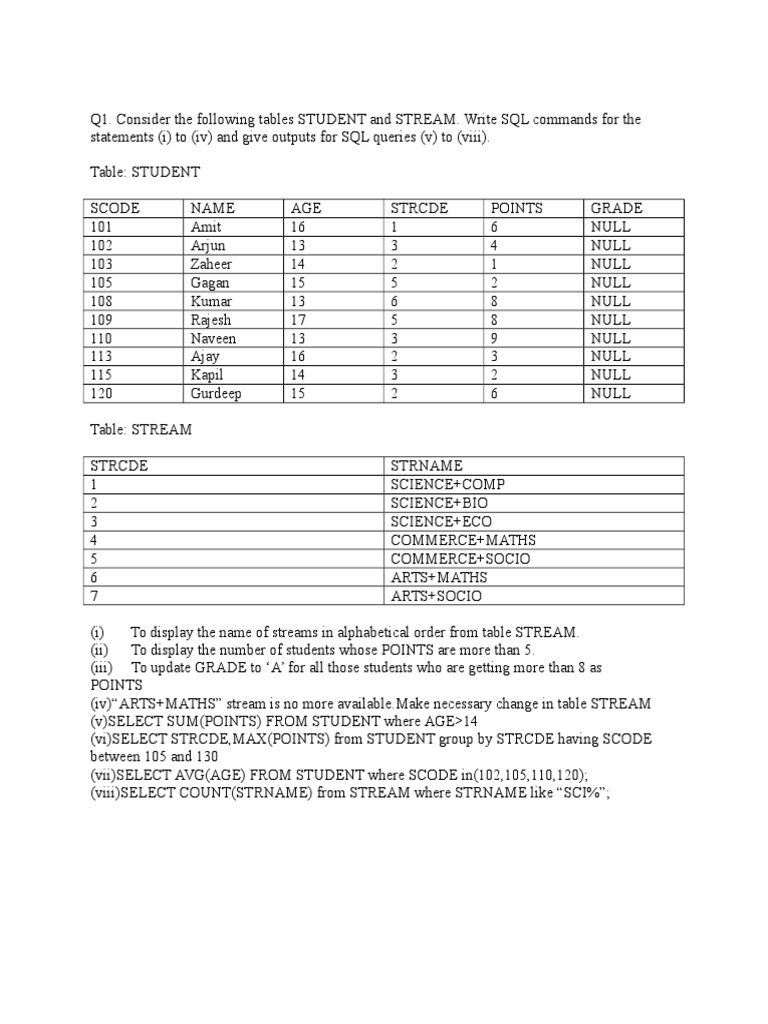 Q1. Consider the following tables STUDENT and STREAM.