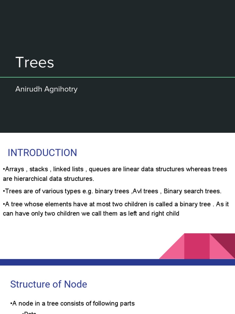 Trees are of various types e.g. binary trees ,Avl trees , Binary search trees.