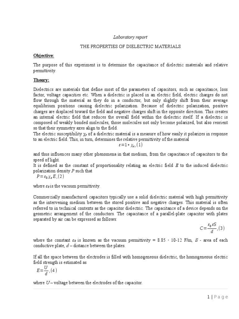 Laboratory work THE PROPERTIES OF DIELECTRIC MATERIALS