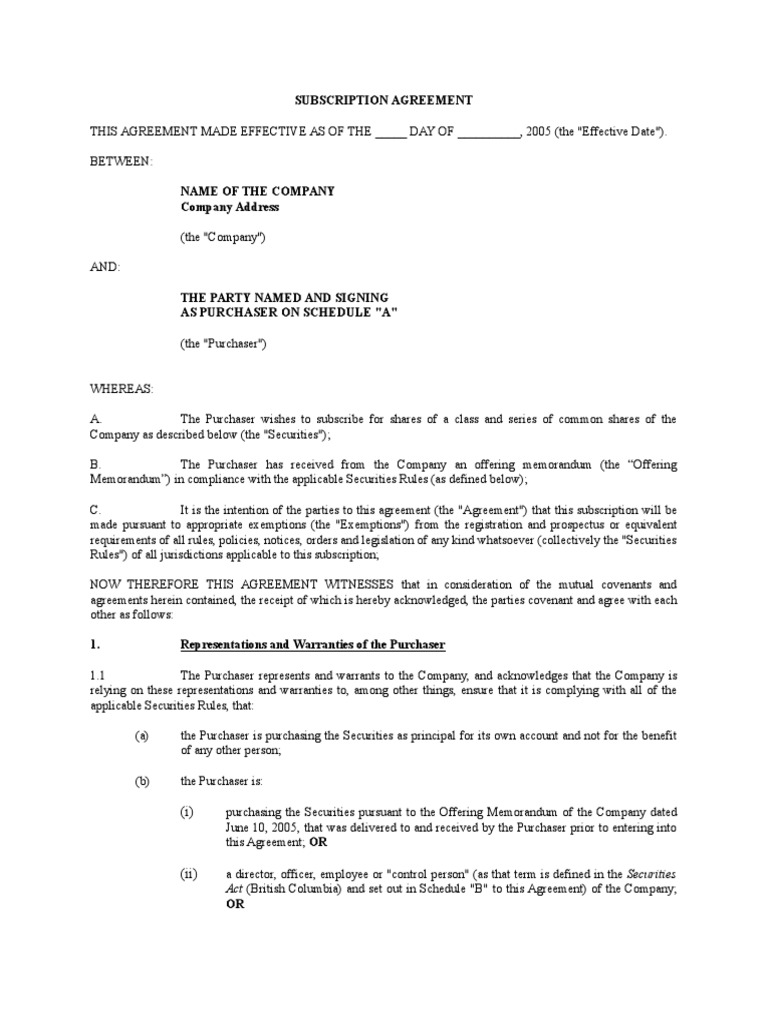 It is the intention of the parties to this agreement (the "Agreement") that this subscription will be