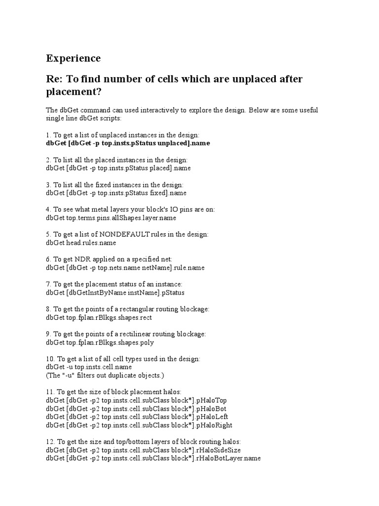 dbGet [dbGet -p top.insts.pStatus unplaced].name