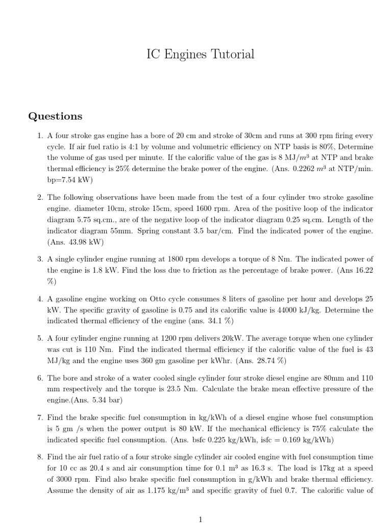 1. A four stroke gas engine has a bore of 20 cm and stroke of 30cm and runs at 300 rpm firing every