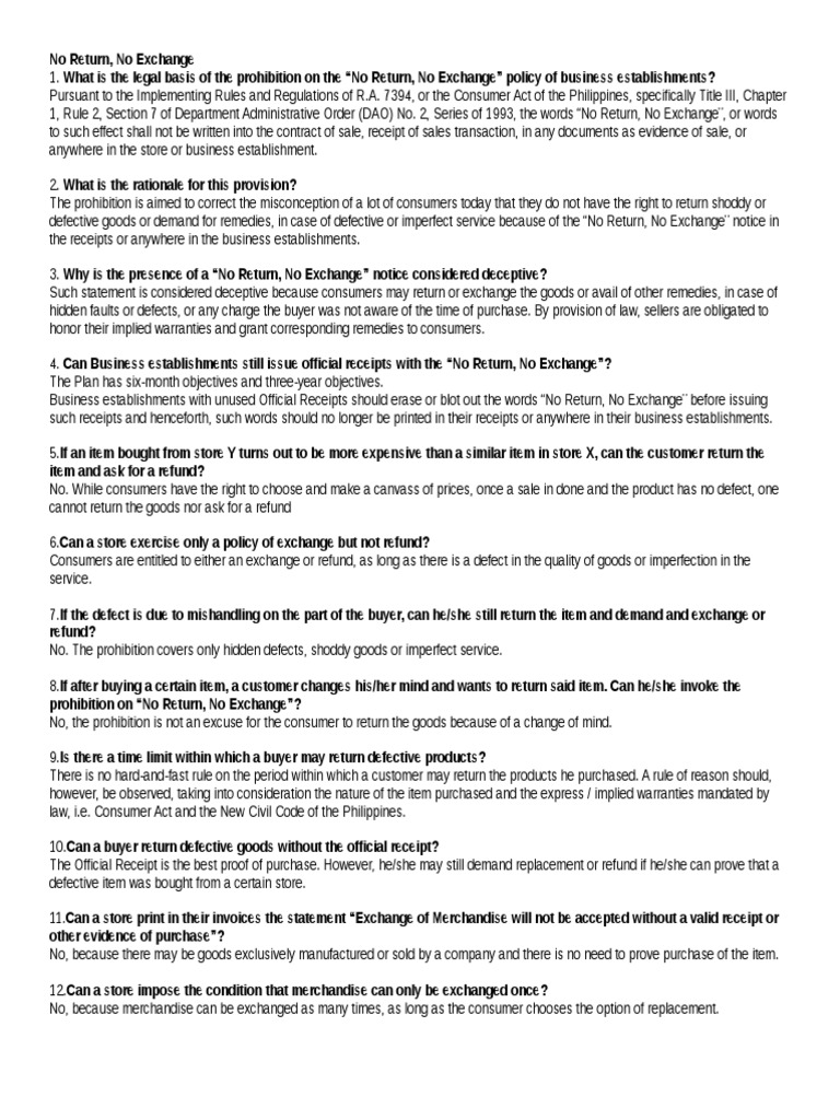 1. What is the legal basis of the prohibition on the No Return, No Exchange policy of business establishments?