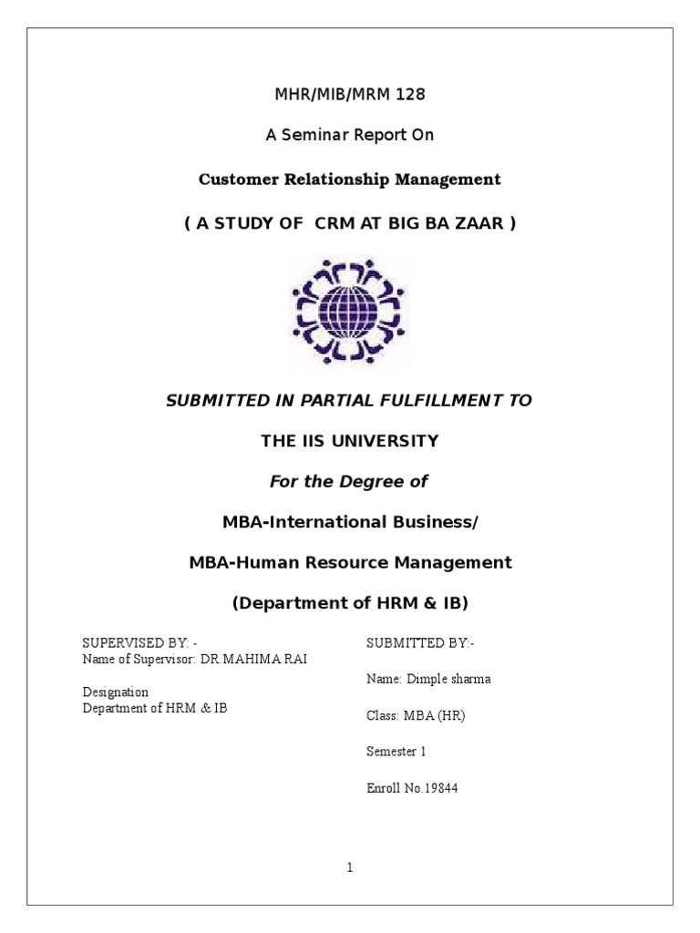 by me is customer relationship management: case study of big bazaar. In this I have tried to