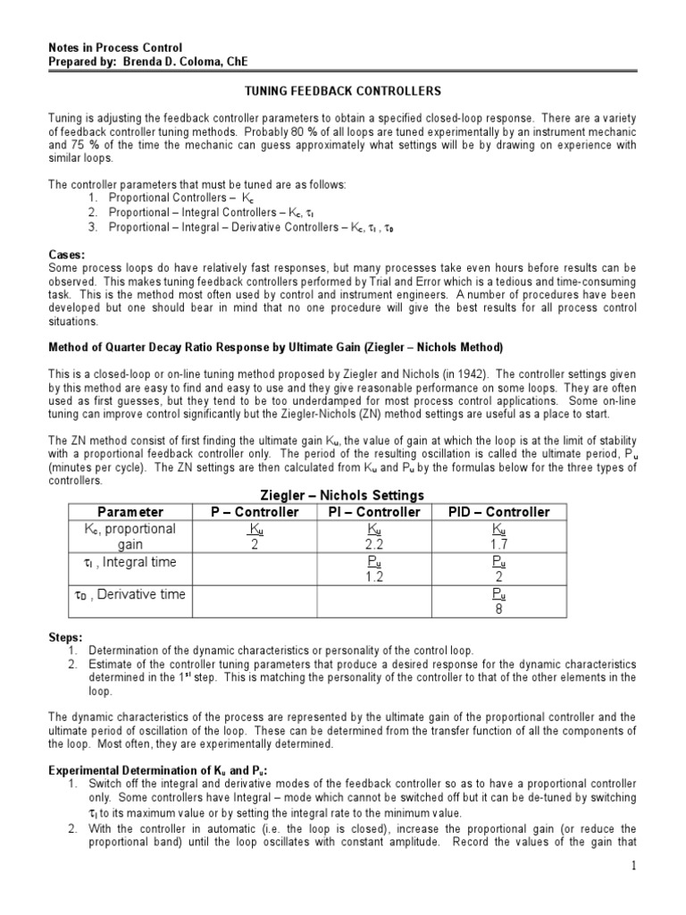 of feedback controller tuning methods. Probably 80 % of all loops are tuned experimentally by an instrument mechanic