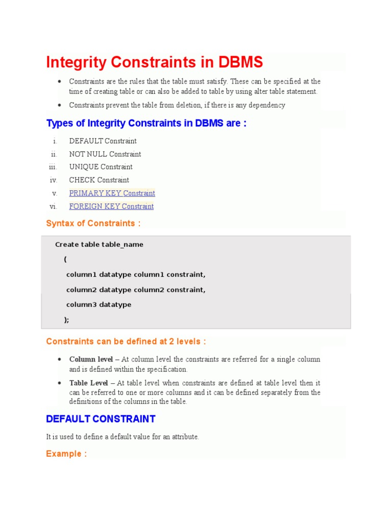 Constraints are the rules that the table must satisfy. These can be specified at the