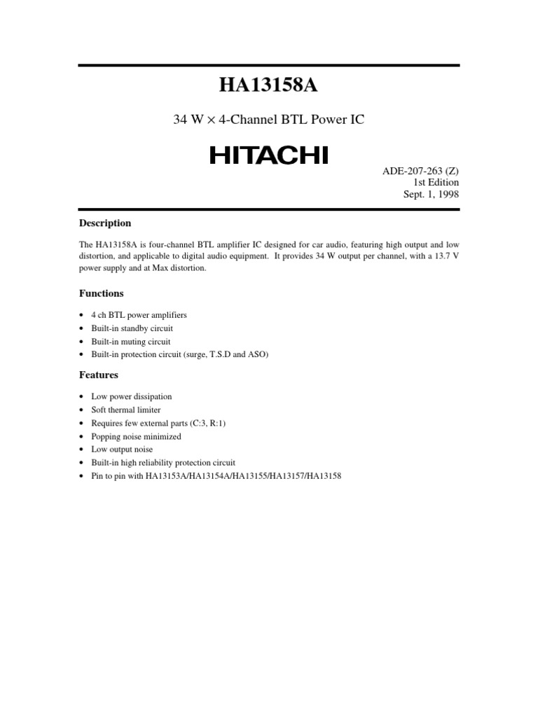 The HA13158A is four-channel BTL amplifier IC designed for car audio, featuring high output and low