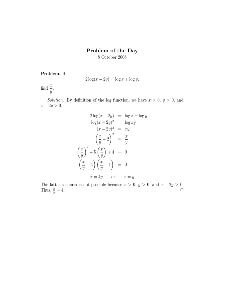 Solution. By definition of the log function, we have x > 0, y > 0, and