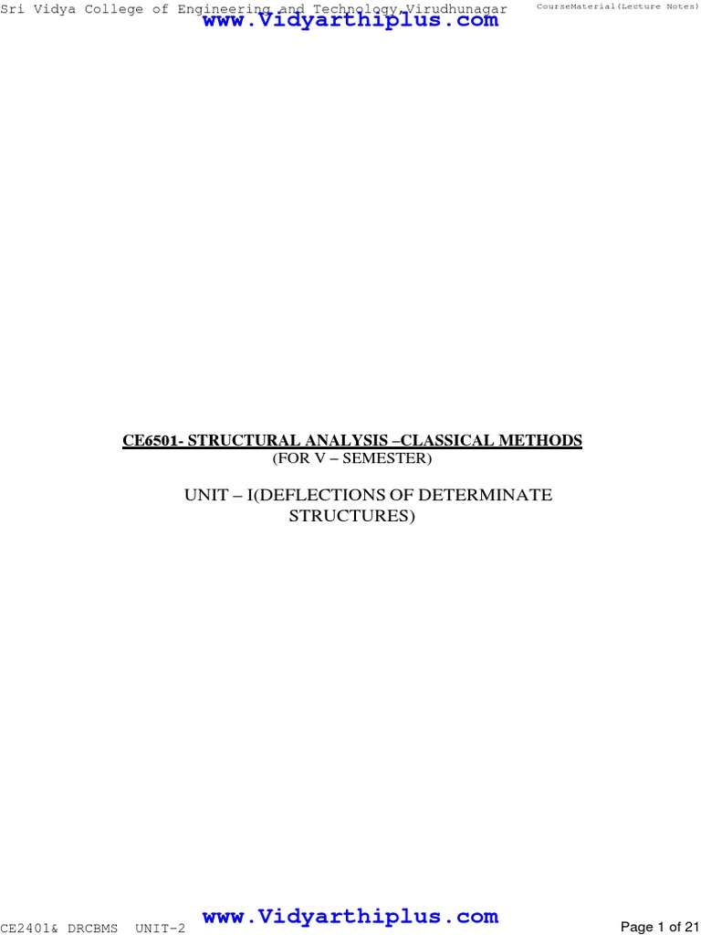 CE6501- STRUCTURAL ANALYSIS CLASSICAL METHODS