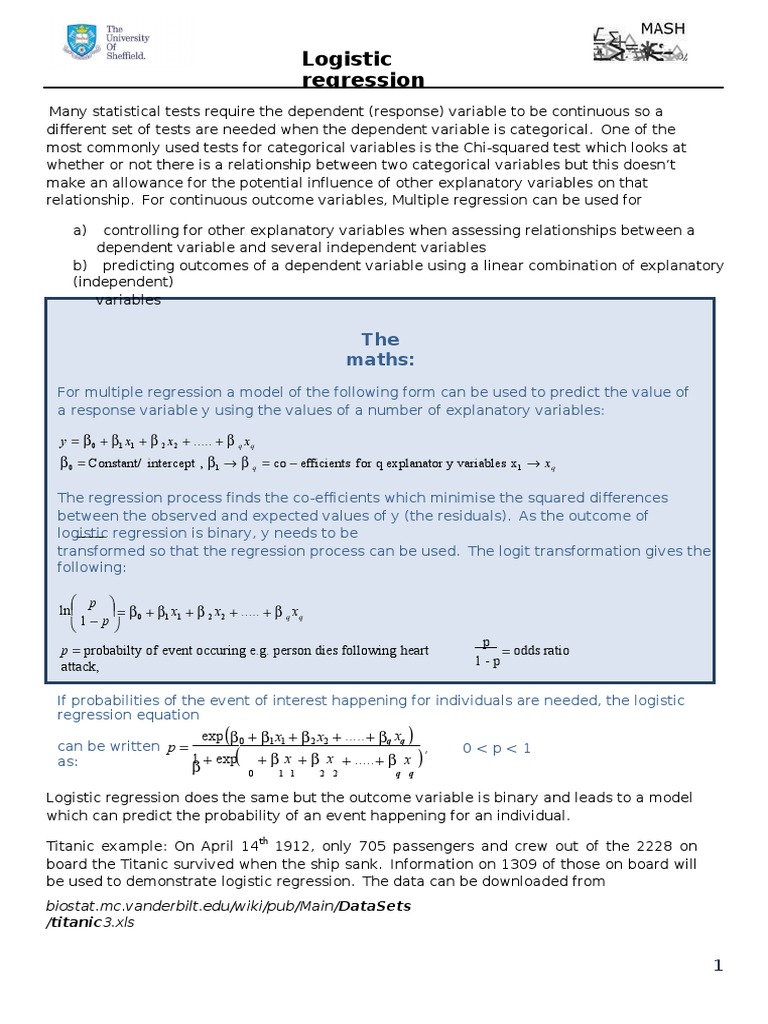 Possible explanatory variables: Age, gender (recode so that sex = 1 for females and 0 for