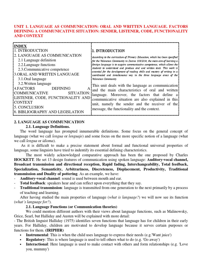 UNIT 1. LANGUAGE AS COMMUNICATION: ORAL AND WRITTEN LANGUAGE.