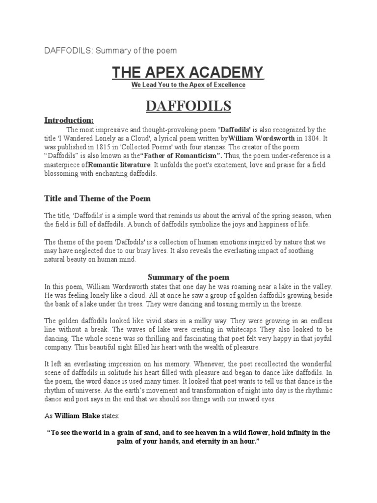 To sum up, one may say that the poem Daffodils is master-piece of poetic art. As the