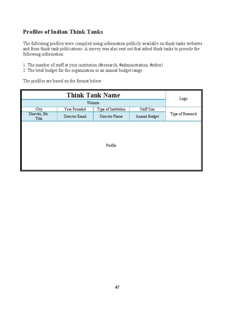 and from think tank publications. A survey was also sent out that asked think tanks to provide the