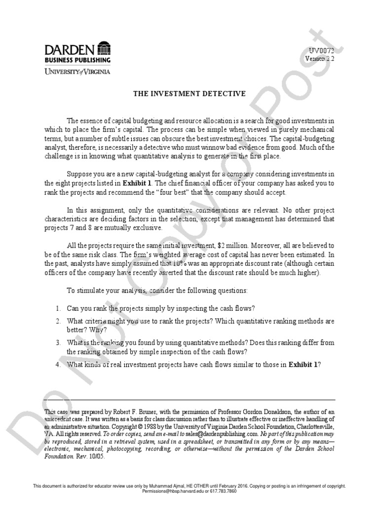 the eight projects listed in Exhibit 1. The chief financial officer of your company has asked you to