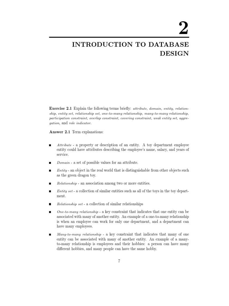 Exercise 2.1 Explain the following terms briey: attribute, domain, entity, relationship, entity set, relationship set, one-to-many relationship, many-to-many relationship,