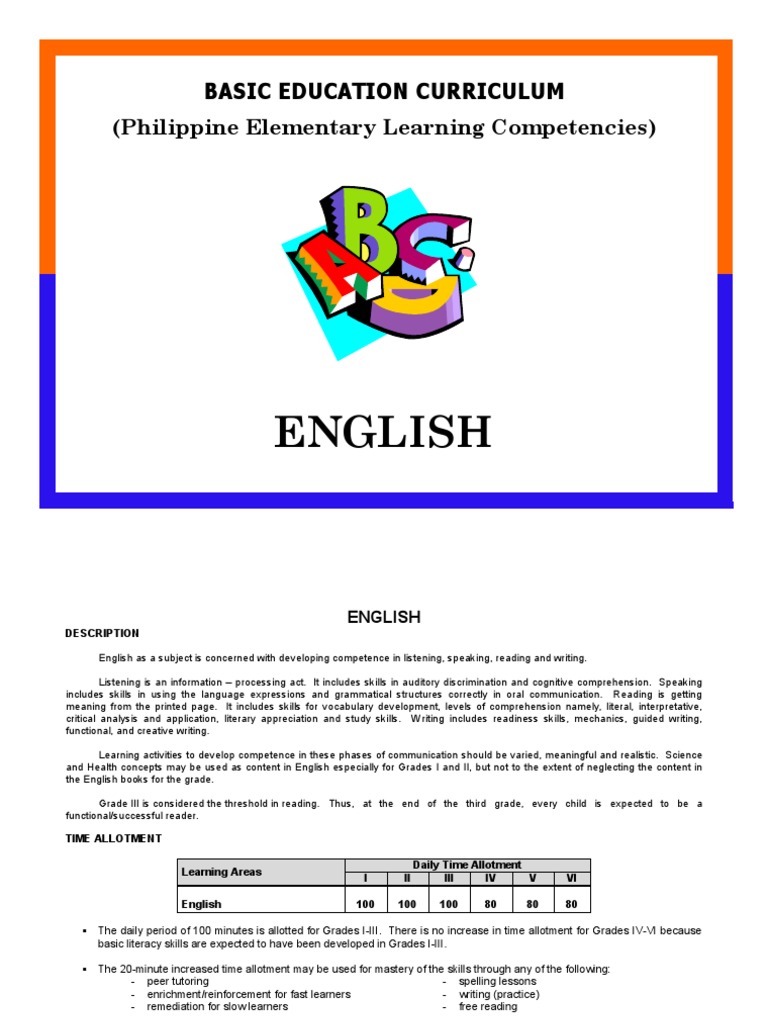 and Health concepts may be used as content in English especially for Grades I and II, but not to the extent of neglecting the content in