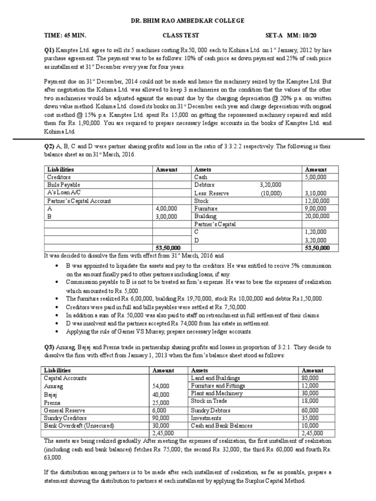 Q1) Kamptee Ltd. agree to sell its 5 machines costing Rs.50, 000 each to Kohima Ltd. on 1 st January, 2012 by hire