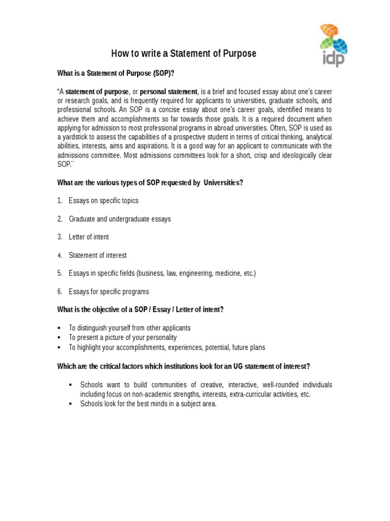 professional schools. An SOP is a concise essay about one's career goals, identified means to
