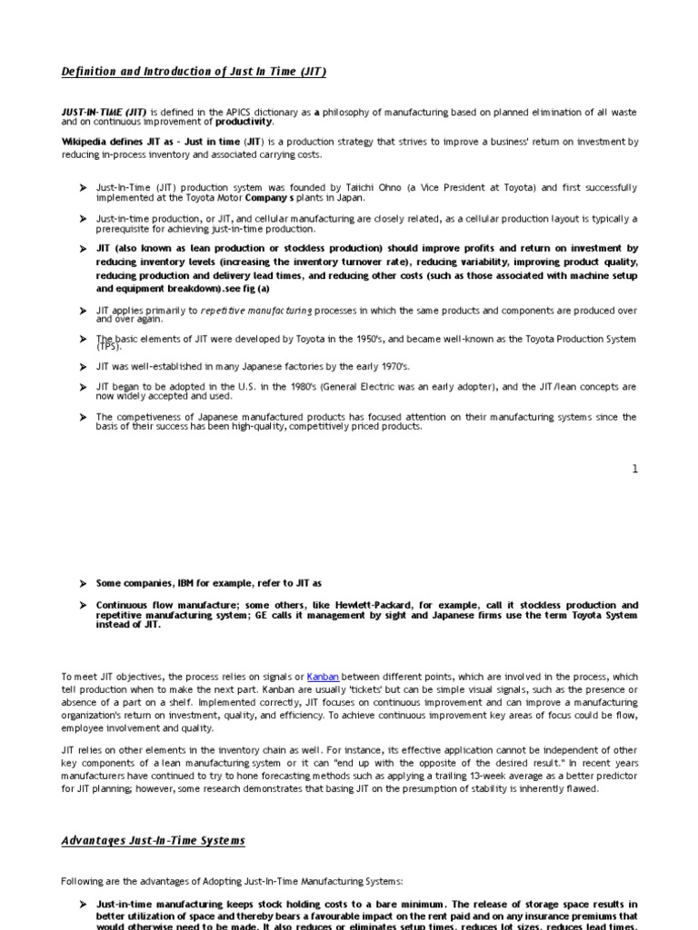 JUST-IN-TIME (JIT) is defined in the APICS dictionary as a philosophy of manufacturing based on planned elimination of all waste